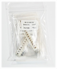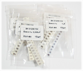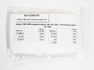SMD (ЧИП) конденсаторы, диэлектрик Y5V, рабочее напряжение до 50В, Набор состоит из 7 номиналов от 0,068uF до 2.2uF. Каждый номинал находится в отдельном промаркированном пакетике с застежкой.