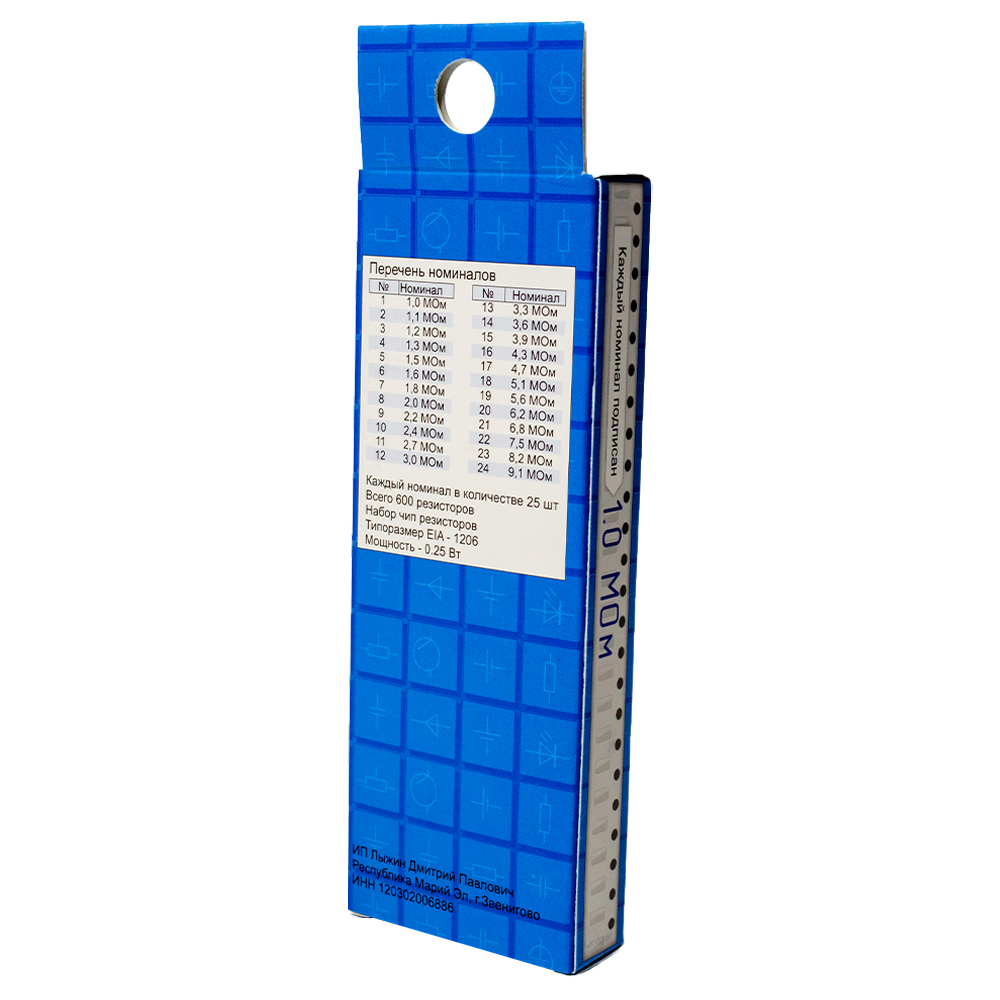 Номинал Количество 1,0 МОм 25 шт. 1,1 МОм 25 шт. 1,2 МОм 25 шт. 1,3 МОм 25 шт. 1,5 МОм 25 шт. 1,6 МОм 25 шт. 1,8 МОм 25 шт. 2,0 МОм 25 шт. 2,2 МОм 25 шт. 2,4 МОм 25 шт. 2,7 МОм 25 шт. 3,0 МОм 25 шт. 3,3 МОм 25 шт. 3,6 МОм 25 шт. 3,9 МОм 25 шт. 4,3 МОм 25 шт. 4,7 МОм 25 шт. 5,1 МОм 25 шт. 5,6 МОм 25 шт. 6,2 МОм 25 шт. 6,8 МОм 25 шт. 7,5 МОм 25 шт. 8,2 МОм 25 шт. 9,1 МОм 25 шт. -