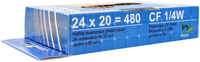 Набор выводных резисторов. Резисторы CF 1/4W, мощностью 0.25Вт, допуск ±5%. Набор содержит 24 номинала (ряд E24) по 20шт. Каждый номинал находится в отдельной ленте, с маркировкой номинала на ленте. Всего 480 резисторов.