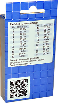 Номинал Количество 10 Ом 20 шт. 11 Ом 20 шт. 12 Ом 20 шт. 13 Ом 20 шт. 15 Ом 20 шт. 16 Ом 20 шт. 18 Ом 20 шт. 20 Ом 20 шт. 22 Ом 20 шт. 24 Ом 20 шт. 27 Ом 20 шт. 30 Ом 20 шт. 33 Ом 20 шт. 36 Ом 20 шт. 39 Ом 20 шт. 43 Ом 20 шт. 47 Ом 20 шт. 51 Ом 20 шт. 56 Ом 20 шт. 62 Ом 20 шт. 68 Ом 20 шт. 75 Ом 20 шт. 82 Ом 20 шт. 91 Ом 20 шт. -