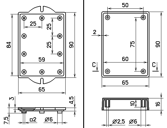 Габаритные размеры - 90х65х19 мм без проушин, 105x65x19 с проушинами.